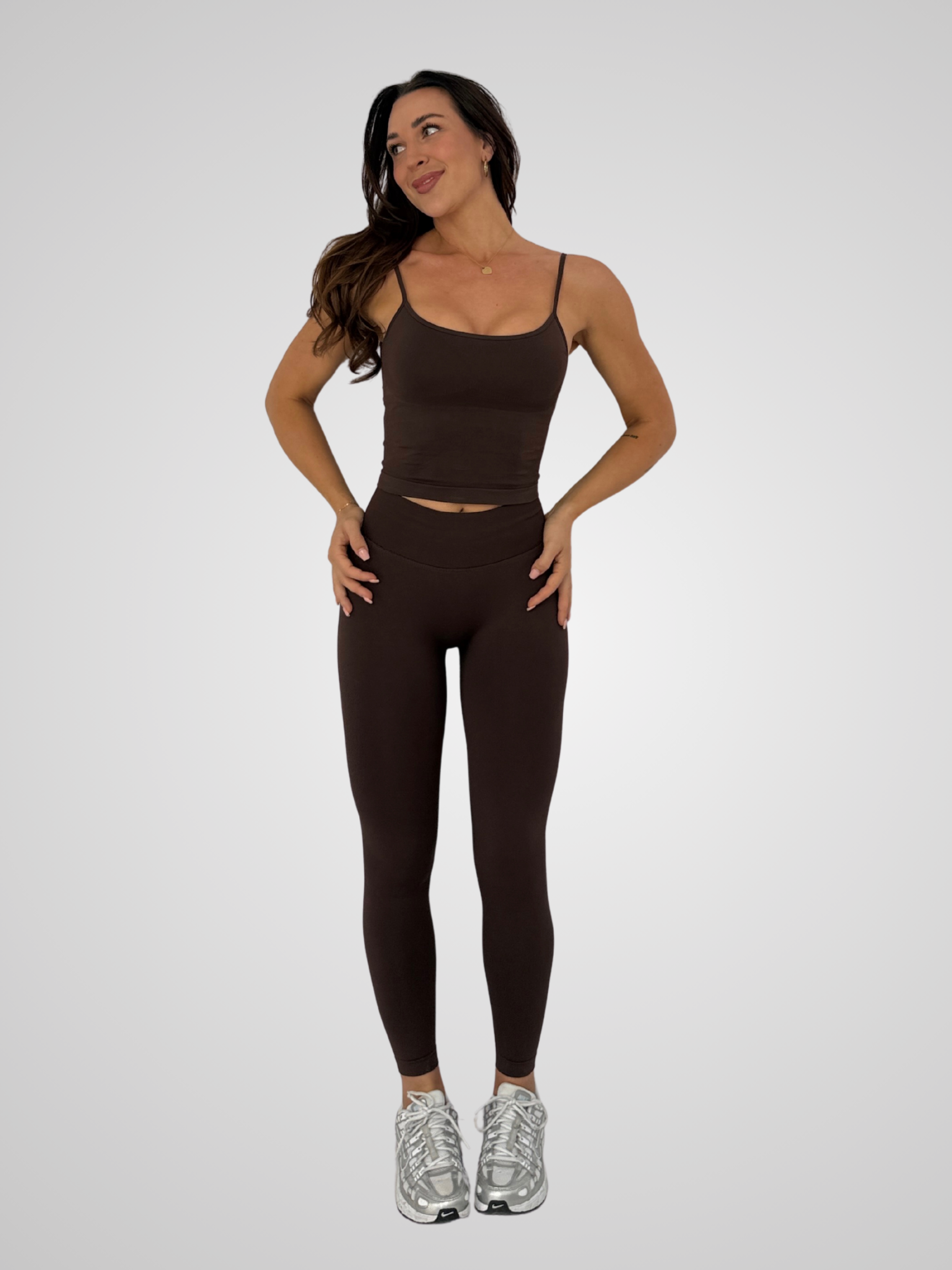 Der warme Braunton unterstreicht die feminine Silhouette und macht die Leggings zum Statement – ob im Gym, im Alltag oder als Styled Look. Formend, bequem und gemacht, um dich stark fühlen zu lassen.